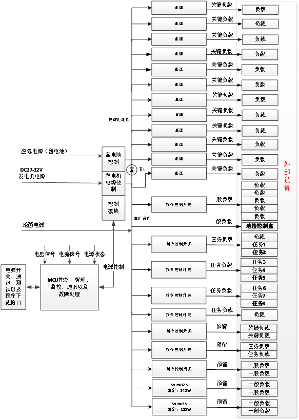 无人机电源管理机作为无人机的一个重要的组成部分,其工作的可靠性对无人机的安全自主飞行具有非常重要的意义。通过电源管理机,实现对无人机全机电源的智能控制和管理,合理分配无人机的电能,提高无人机的飞行可靠性。电源管理机负责所需电源的切换功能管理、状态监控等。